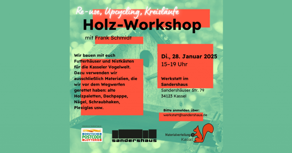 In Zusammenarbeit mit der Offenen Werkstatt des Sandershaus bauen wir mit euch Futterhäuser und Nistkästen für die Kasseler Vogelwelt. Dazu verwenden wir ausschließlich Materialien, die wir vor dem Wegwerfen gerettet haben: alte Holzpaletten, Dachpappe, Nägel, Schraubhaken, Plexiglas usw.