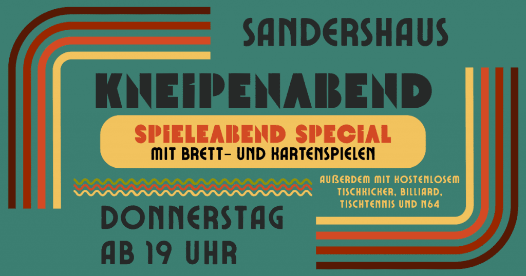 Parallel dazu läuft unser Kneipenabend wie jeden Donnerstag weiter. Zwischen lecker-günstigen Getränken und entspannter Barmusik könnt ihr kostenlos Billard, N64, Kicker oder im Nebenraum auch Tischtennis spielen.